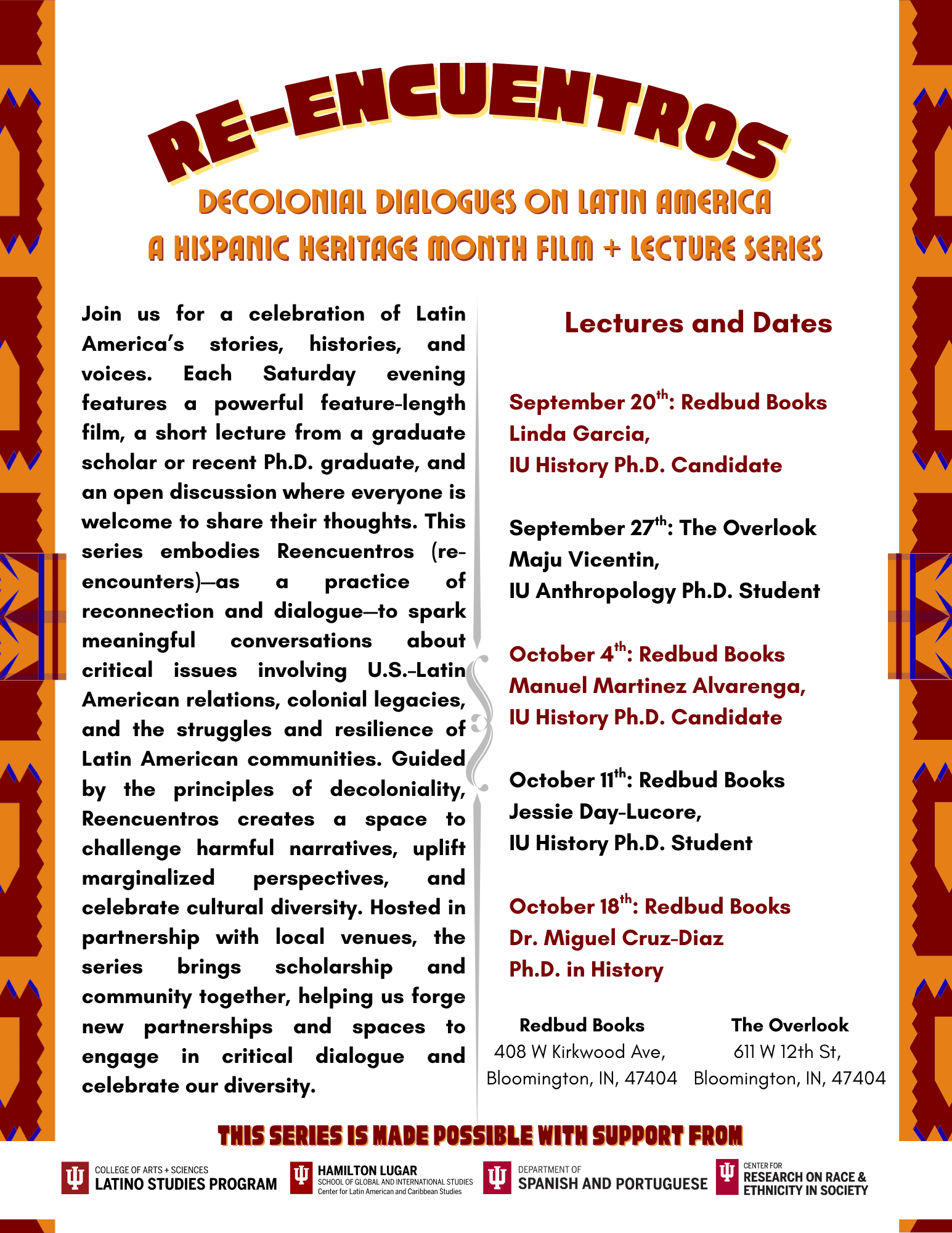 Join us for a celebration of Latin America's stories, histories, and voices. Each Saturday evening features a powerful feature-length film, a short lecture from a graduate scholar or recent Ph.D. graduate, and an open discussion where everyone is welcome to share their thoughts.