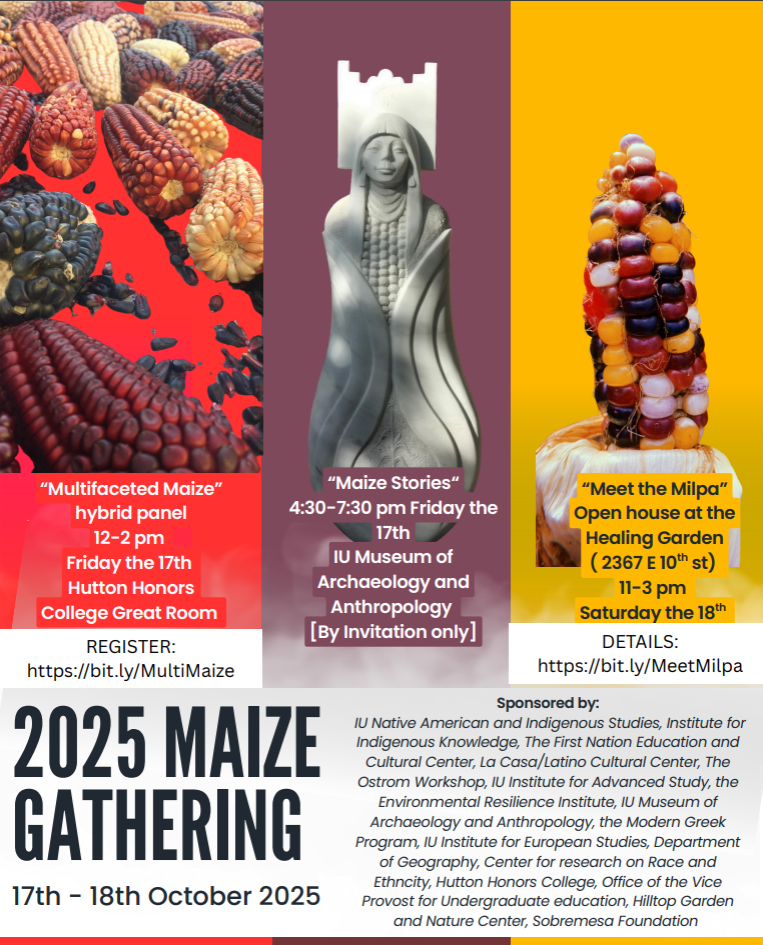 Maize is a protagonist that makes its appearance all across our contemporary world. We engage with it daily – through breakfast cereals, the corn-based coating on medicines, or the corn syrup in our desserts. Food sovereignty movements across Turtle Island argue that how we engage with maize is a choice that shapes our societies. This event seeks to bring together different perspectives on maize, from Indiana’s “corn belt”, to food sovereignty and seedkeeping movements in Tlaxcala, Mexico, and Greece, through three events Oct. 17th-18th.